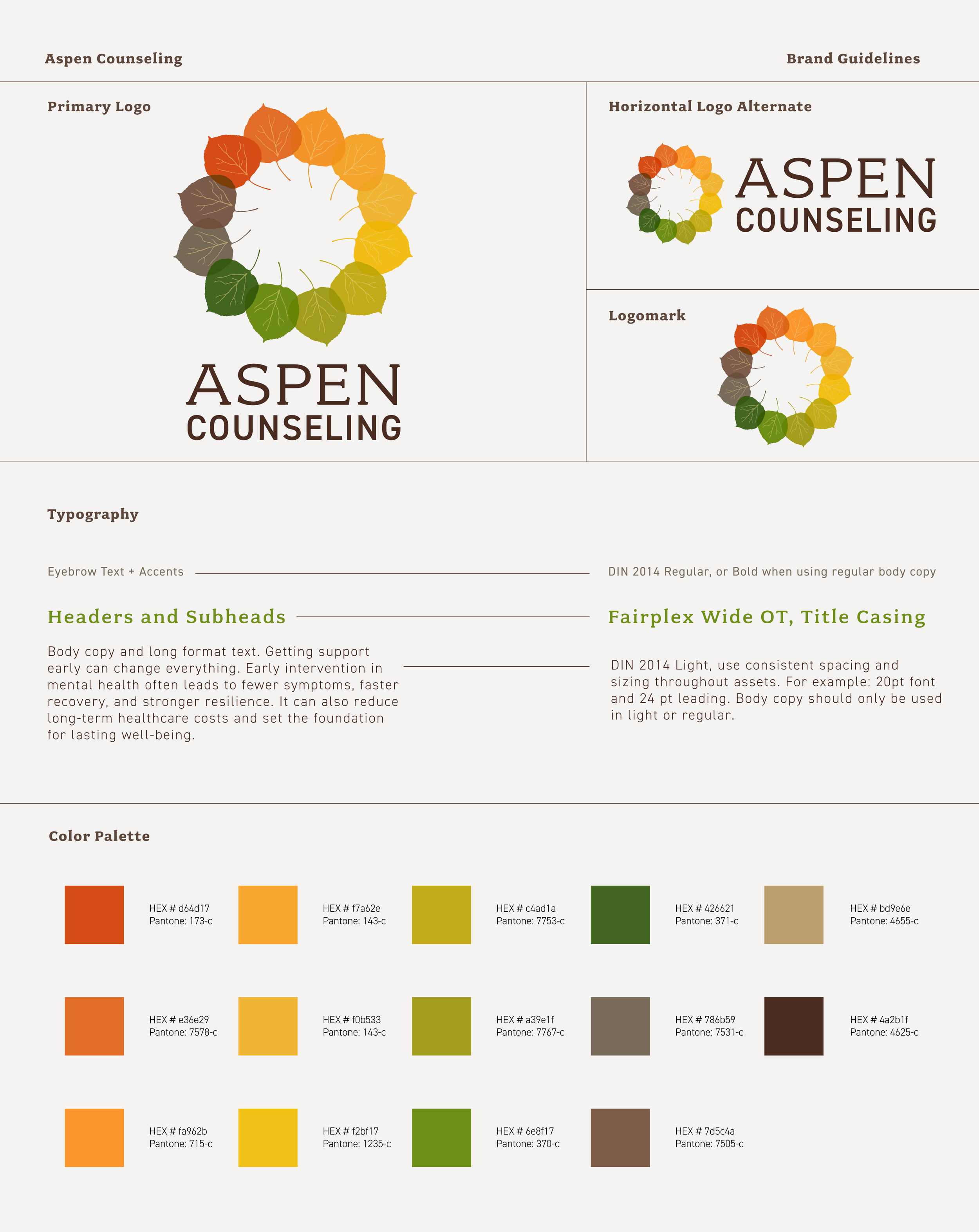 Brand identity and design guide, including: logotype, color guide, typography, and brand elements.